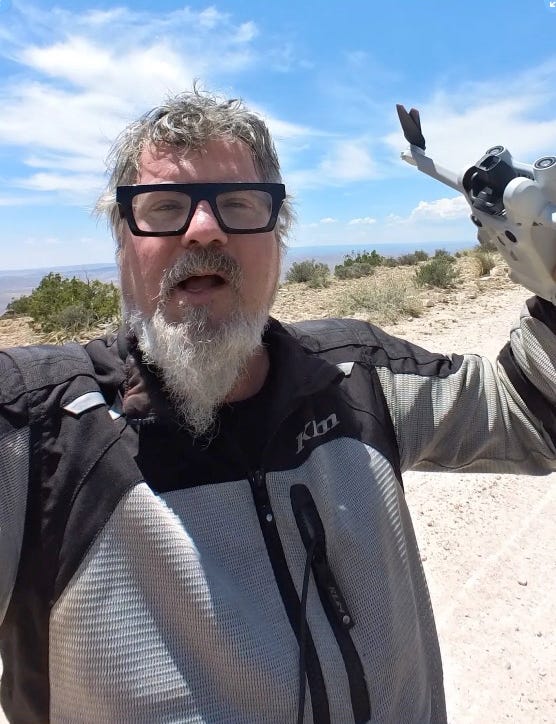 I came to an especially nice section of the road near the rim and got the drone out. I was sort of leapfrogging with it, sending it down the road and then riding through and then sending it off to the side and riding through, etc. And one time, I rode too far. The remote said, “Disconnected.” Shit. I sped back - I’d ridden way too far away from it. I haven’t wrecked a drone in a long long time and I was going to be bummed if I’d lost this one. At the top of a hill, it connected. YES! But the picture from the camera wasn’t showing and I wasn’t all too sure where it was. Then is said, “Battery dead, landing.” NO! So now - I have to figure out where the hell it was. I had a mark on the map on the remote - so I headed there panicking that I’d lost the footage I’d already taken (and that I’d lost an expensive as shit drone). I got off the bike and started running around looking for it in the dusty scrub. I was right on top of the spot where it was supposed to be, but it wasn’t there. It was kind of close to the cliff and I thought - oh no - it landed at the bottom somewhere. But then, there it was! Some music swelled and we embraced. I leaned in for a kiss, but the drone had zero interest in that. Prude.