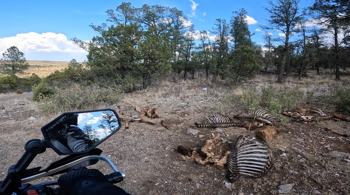 Nope. Not all that inviting. I looked around a bit more, and went down a few roads that weren’t really roads. I couldn’t find the place. Ugh! There was one spot I’d scoped out on iOverlander so I headed toward it. There was a gate that said, “Please Close Gate, Thank You!” I took that to mean, “You can come through here…” But still, I always get a bit nervous about stuff like this. Then the thunder started. Oh jeez, I gotta find a place and get set up pronto. I rode up to this. If you can’t tell what that lump is, it’s a dead cow.