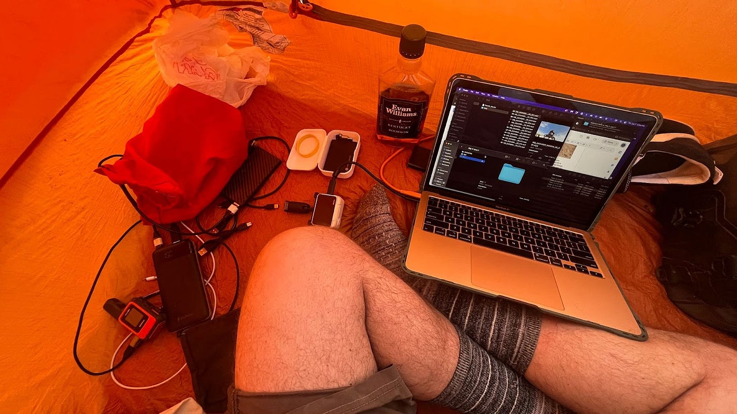 I got the bike put back together right as the rain started falling. I crawled into the tent and started doing my charging and writing. This is what my office looks like. The only thing I like about it is the Evan Williams that a viewer gifted me (thank you Richard!) and my sexy legs. It takes me a solid 2 hours to get everything done. So getting to camp at 5 pm or so is ideal for me. Then when I’m finished I can chill for a minute, toast the day with a little swig, and get to sleep early so I can get out of here before Angry Rancher shows up.