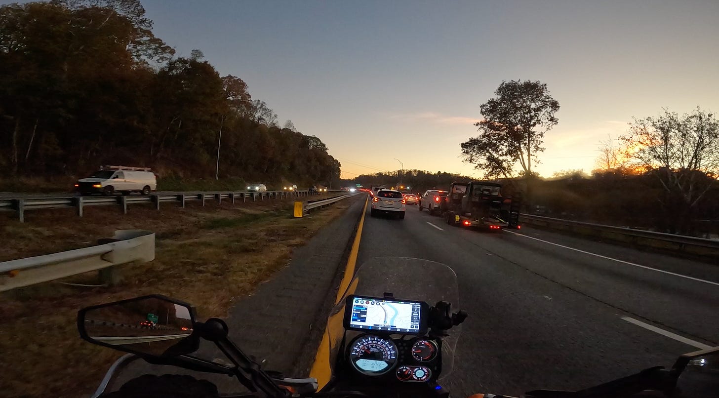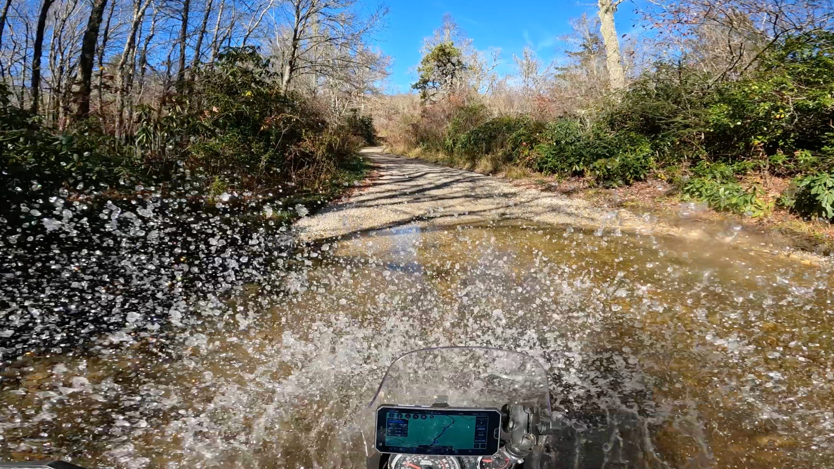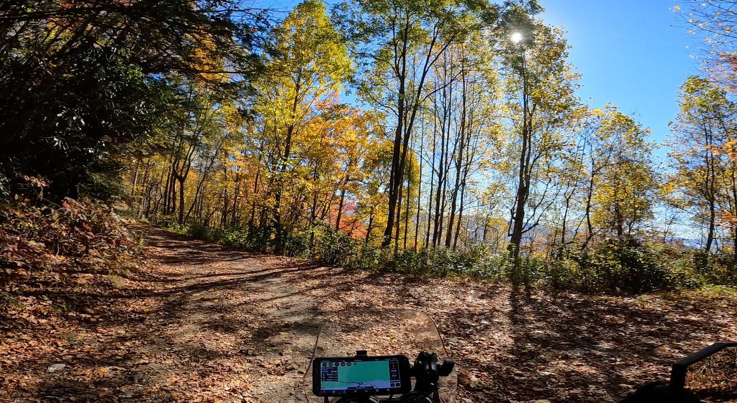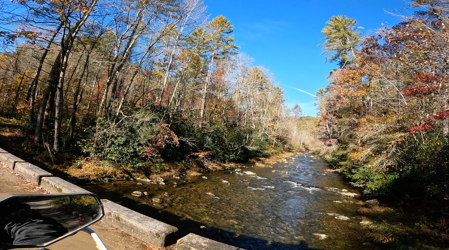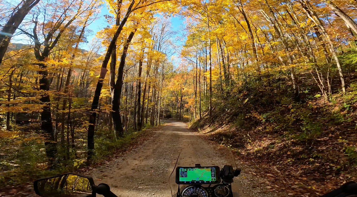 And then I hit Porterfield Gap, and this road is in the pantheon of all motorcycle roads. The road sign said “Private” - but I didn’t believe it, and I was right not to. This road was everything you want. Rocky, steep, slippery at times, and all around action-packed. And talk about remote. I climbed and climbed and climbed and then set across the ridge of this mountain. Again, the sun, the leaves, the sky, and the long-distance views of the mountains beyond Andrews, North Carolina, were just breathtaking. No scares or mishaps, just the best of what this type of motorcycling has to offer. I stopped at the top and launched the drone, and the footage is out of control. (I don’t pull stills from the drone for Substack because it’s too much of a hassle.) After hours of this, I finally descended into Andrews and gassed up. This is now my favorite road of all time. Porterfield Gap.