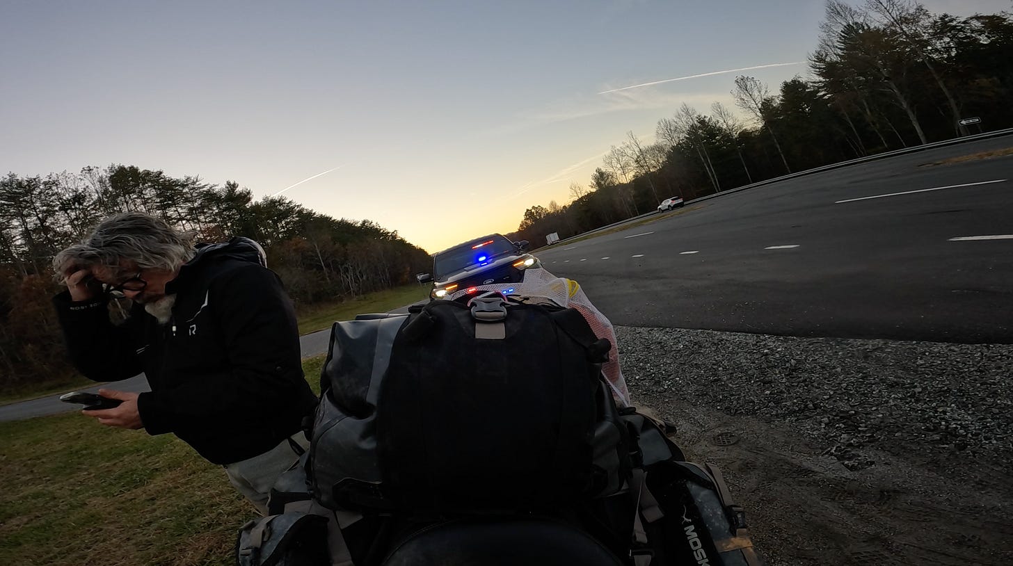 Turns out, the second cop was just stopping to say hi. The first copy gave me back my license and said, “Looks like you’ve been through it - no ticket. Just keep that thing clean.” For some reason, I said, “You too.” But he walked away like he hadn’t heard it. I got on my bike and rode.